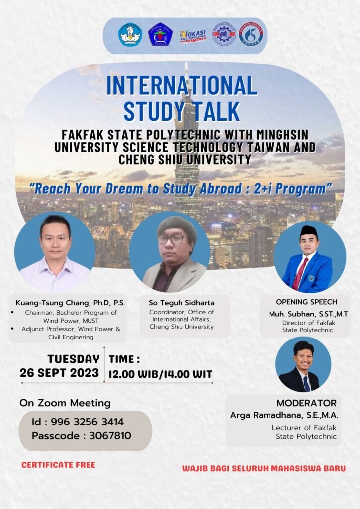 Hi Sobat Polinef ! Politeknik Negeri Fakfak Present : INTERNATIONAL STUDY TALK Fakfak State Polytechnic with Minghsin University Science Technology Taiwan (MUST) and Cheng Shu University (CSU) Kepada seluruh mahasiswa baru Polinef, diharapkan mengikuti kegiatan tersebut yang akan dilaksanakan pada: Hari/Tanggal : Selasa/26 September 2023 Pukul : 14.00 WIT – Selesai Zoom: […]