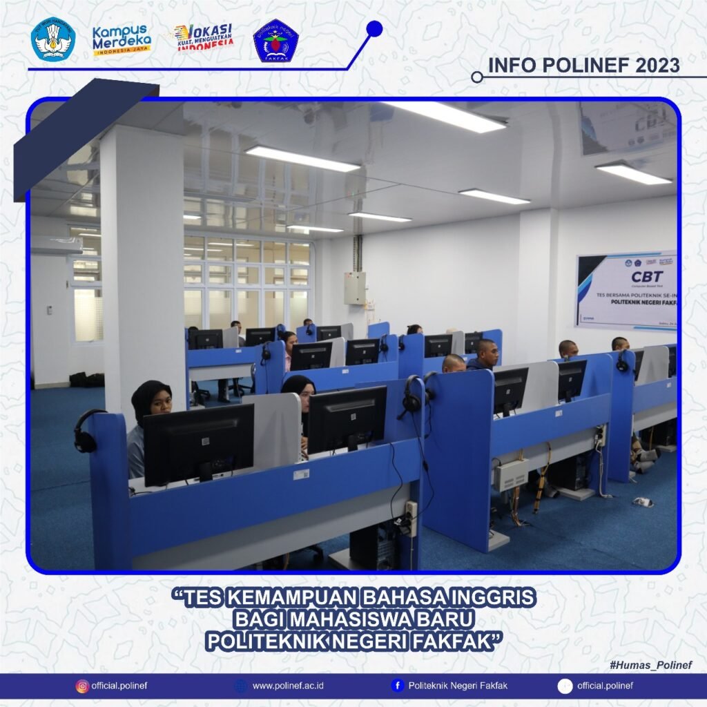 Fakfak, 15 September 2023 – Salah satu langkah Politeknik Negeri Fakfak untuk meningkatkan mutu pendidika dan lulusan adalah Tes Kemampuan Bahasa Inggris (TKBI). Berdasarkan Surat Edaran Direktur Polinef dengan nomor 4186/PL35/LL/2023, mahasiswa baru TA 2023/2024 dan seterusnya wajib mengikuti TKBI di UPT Bahasa Polinef. Ujian perdana ini dilaksanakan tanpa biaya/gratis. Namun, bila nilai TKBI belum […]