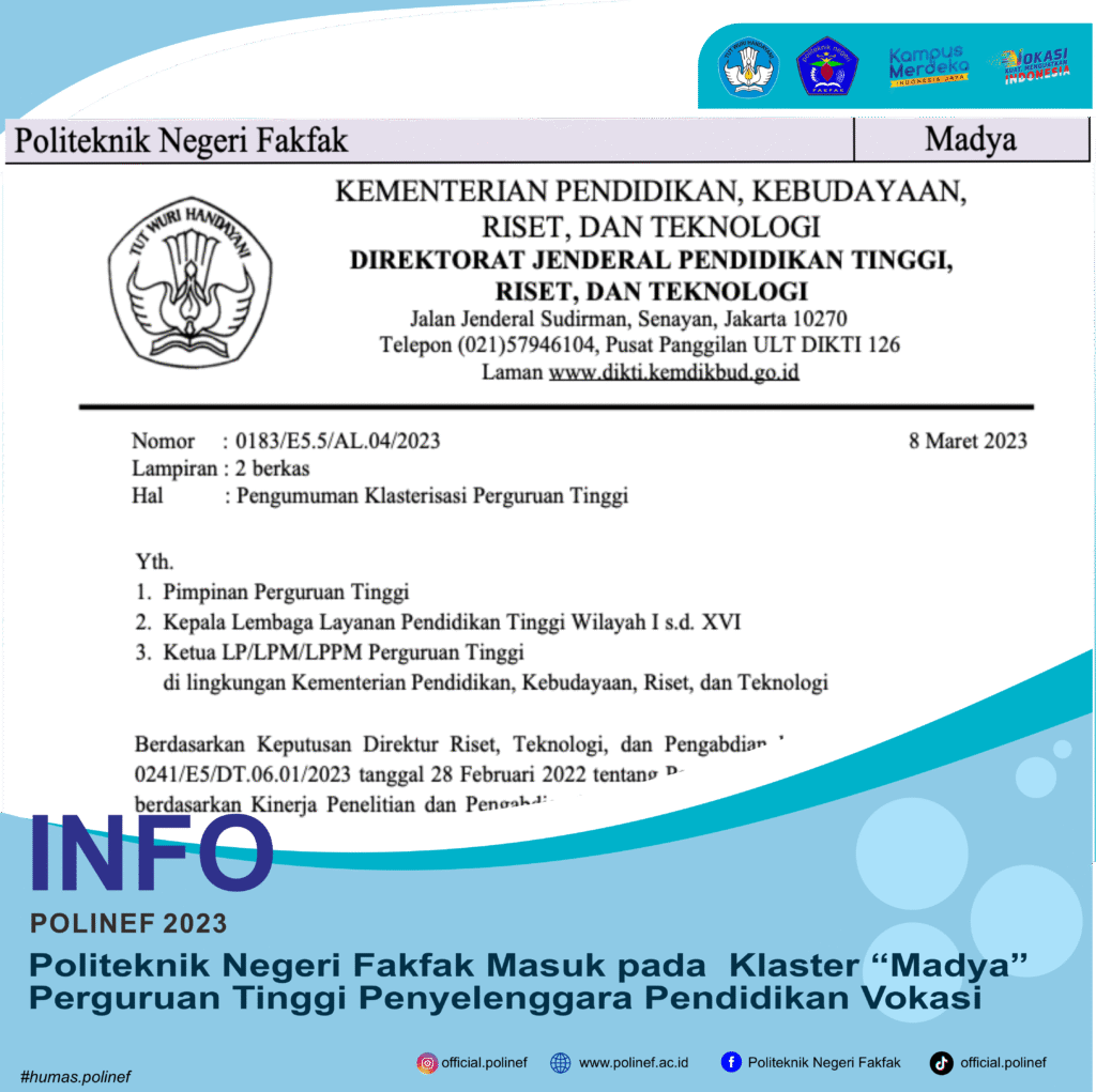 [vc_row][vc_column][vc_column_text]Selamat, Politeknik Negeri Fakfak masuk dalam klaster “Madya” Perguruan Tinggi Penyelenggaraan Pendidikan Vokasi Berdasarkan Keputusan Direktur Riset, Teknologi, dan Pengabdian kepada Masyarakat Nomor 0241/E5/DT.06.01/2023 tanggal 28 Februari 2022 tentang Penetapan Klasterisasi Perguruan Tinggi berdasarkan Kinerja Penelitian dan Pengabdian kepada Masyarakat. Semoga ke depannya, data kinerja dosen yang meliputi penulis (author), afiliasi (affiliation), jurnal (journal), penelitian (research), […]