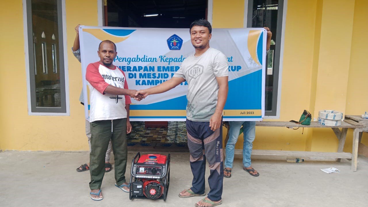 “Emergency Backup selain dari PLN benar-benar menjadi kebutuhan dasar. Sebab saat terjadi pemadaman listrik oleh PLN, kegiatan ibadah di Mesjid tidak lagi terganggu. Terutama pada saat malam hari, dimana Mesjid Nur Tholib saat ini tidak hanya digunakan untuk Ibadah Sholat, tetapi juga digunakan sebagai tempat belajar Al-Quran bagi anak-anak yang ada di sekitaran Mesjid” Ujarnya.Gambar 1 serahterima barang emergency back up